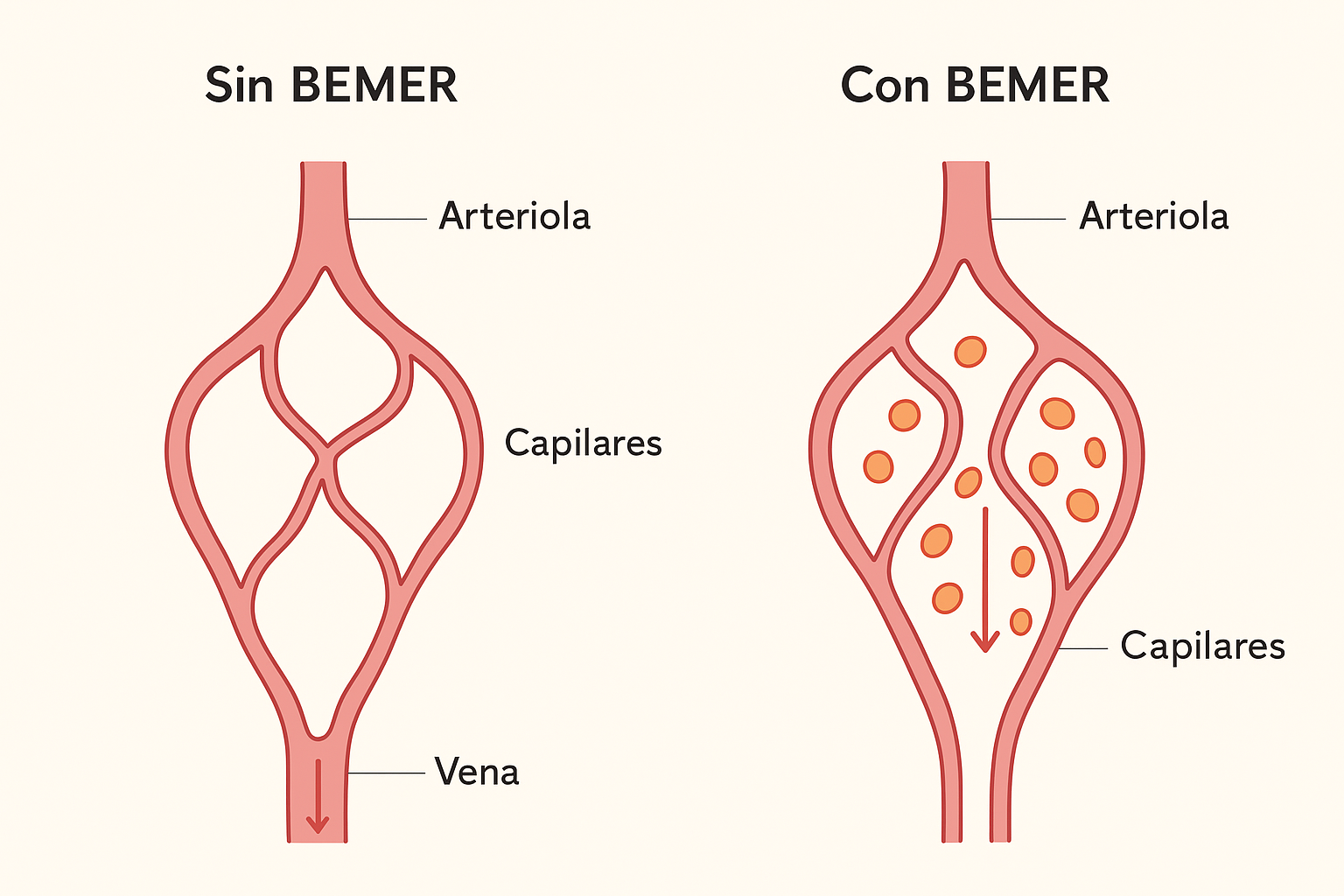 Diagrama sugerido: flujo sanguíneo capilar antes y después de BEMER, mostrando incremento de perfusión.